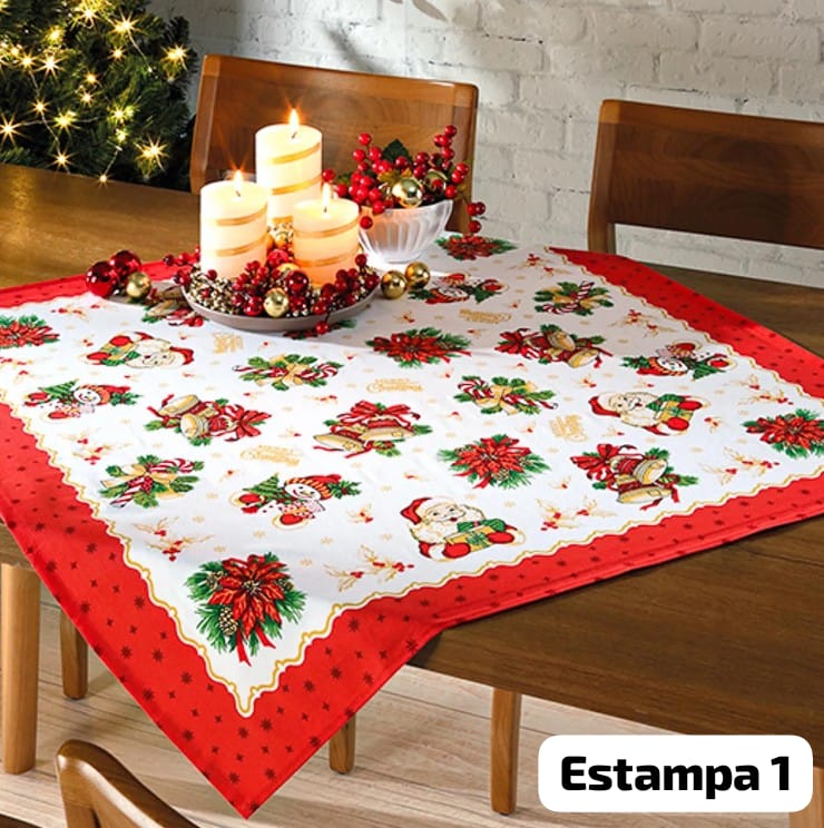Com medida de 78cm x 78cm, é ideal para ser usada como centro de mesa, sobrepostos em outras toalhas ou diretamente sobre móveis. A barra vermelha com ornamentos festivos adiciona um toque refinado e alegre, valorizando ainda mais a decoração da sua casa.